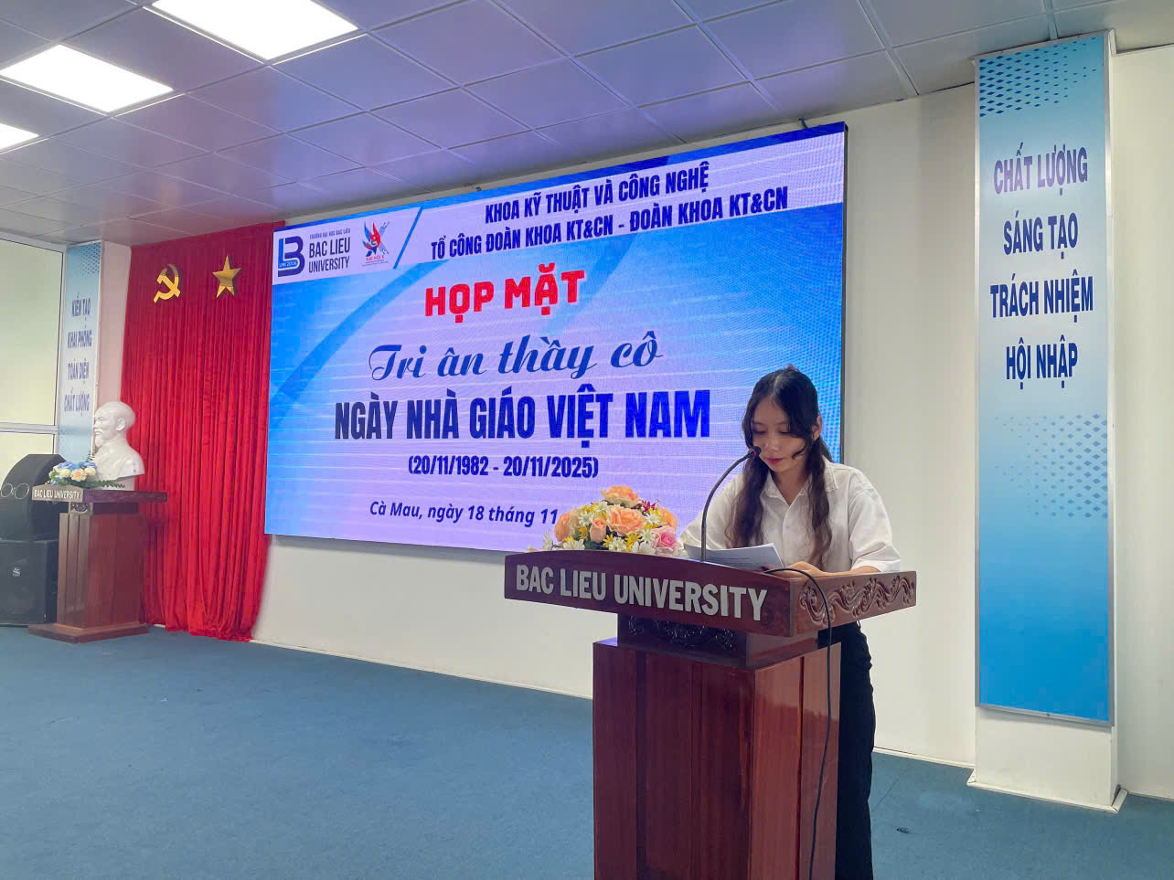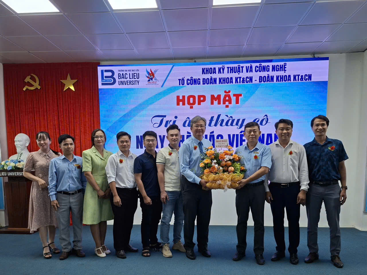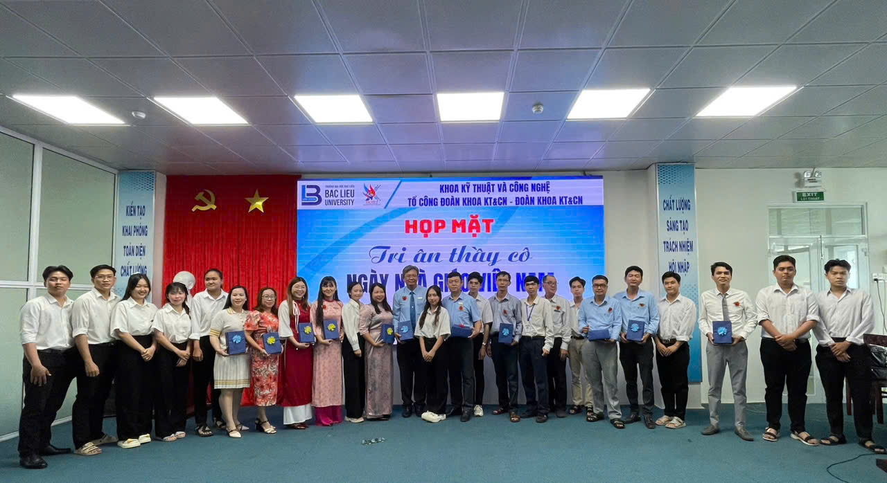 Ngày 18 tháng 11 năm 2025, tại Hội trường Nhà Điều hành, Cơ sở 1, Trường Đại học Bạc Liêu, Khoa Kỹ thuật và Công nghệ, Tổ công đoàn Khoa phối hợp cùng Đoàn Khoa tổ chức buổi họp mặt tri ân thầy cô nhân ngày Nhà Giáo Việt Nam 20-11. Đây là dịp để các thế hệ học trò bày tỏ lòng biết ơn sâu sắc đến các thầy và nhằm gắn bó giữa các thế hệ sinh viên, cùng hỗ trợ, động viên, giúp đỡ nhau trong cuộc sống, nghề nghiệp, hợp tác trong công việc, kết nối và đồng hành với Khoa cùng phát triển. Đến dự buổi họp mặt có: