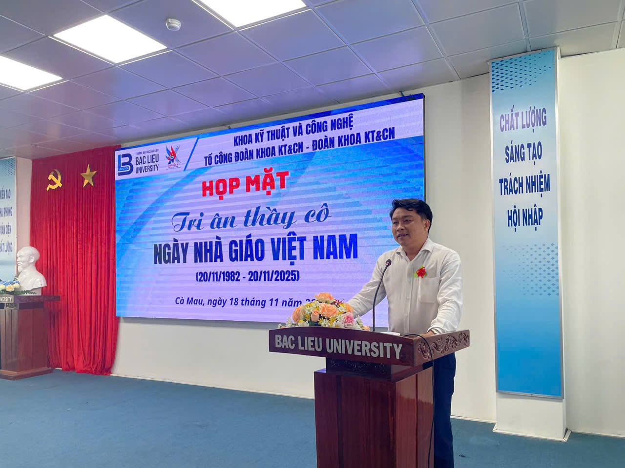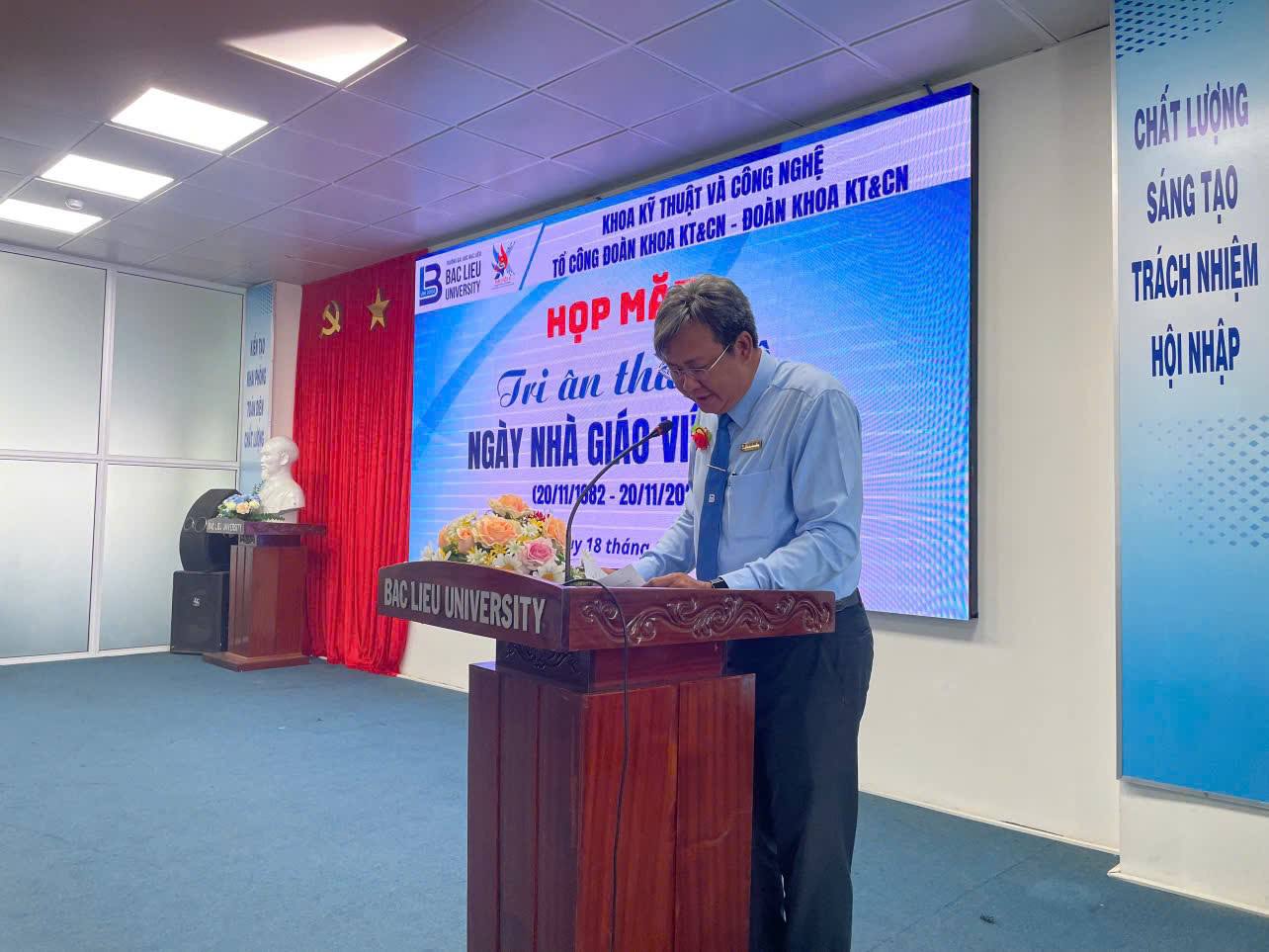 TS. Ngô Đức Lưu - Bí thư Đảng ủy, Chủ tịch Hội đồng Trường phát biểu và đọc diễn văn ngày Nhà Giáo Việt Nam TS. Ngô Đức Lưu - Bí thư Đảng ủy, Chủ tịch Hội đồng Trường, Nguyên Trưởng Khoa Công nghệ thông tin, cùng tập thể giảng viên và sinh viên của Khoa Kỹ thuật và Công nghệ. Khoa rất vinh dự đón tiếp các cựu sinh viên của Khoa hiện đang công tác trong và ngoài Tỉnh cũng đến chức mừng và tri ân thầy cô của Khoa. Đặc biệt có nhiều phụ huynh của các em sinh viên đang học tại Khoa cũng đến tham dự và chúc mừng cho thầy, cô trong Khoa thể hiện sự gắn bó giữa gia đình và nhà trường trong công tác đào tạo sinh viên.